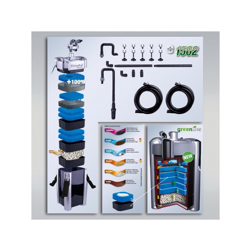 Vaikne pumba võimsusega 1400 l/h. Patenteeritud eelfilter 100% suurem kui mudelil 1501. Kõrge bioloogiline filtreerimine mahuga 12 l, veepeatus, voolikuühendused pöörlevad 360°, kergesti vahetatav filtrimaterjal;